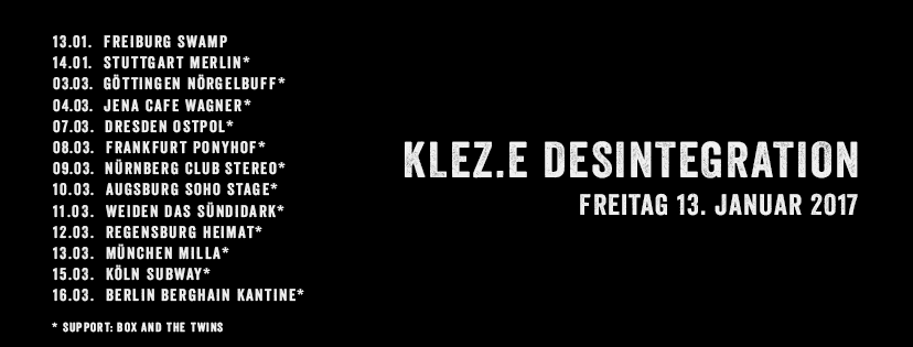 Für all diejenigen, die sich auf dieser Seite tummeln und mit THE CURE noch etwas anfangen können, seien die neuen Songs von KLEZE ans Herz gelegt. Ähnlichkeiten mit den Mannen um Robert Smith sind mit Sicherheit kein Zufall, wie der Titel des im kommenden Jahr (13.01.2017) erscheinenden Albums "Desintegration" (THE CURE: Disintegration) unter Beweis stellt. Die Berliner würden mit Sicherheit auch eine gute Figur aus dem M'ERA LUNA Festival machen...Die Videos zu den ersten beiden Songs gibt es schon im Stream, einfach auf die beiden Links klicken! KLEZ.E 'Flammen' KLEZ.E 'Mauern'
