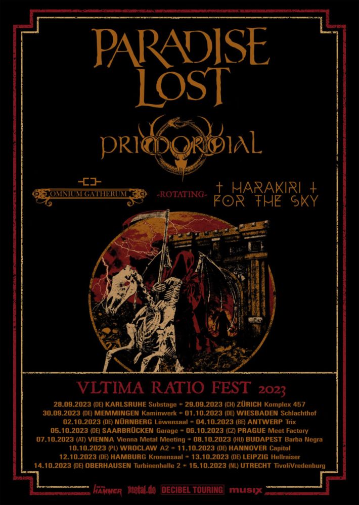 In diesem Jahr kehrt das Ultima Ratio Fest nach seiner erfolgreichen Ausgabe im vergangenen Jahr zurück und geht in die nächste Runde. Neben PARADISE LOST, PRIMORDIAL, HARAKIRI FOR THE SKY und OMNIUM GATHERUM sind auch wir als Veranstalter wieder mit von der Partie. OMNIUM GATHERUM (Karlsruhe, Memmingen, Nürnberg, Saarbrücken, Hamburg, Oberhausen) und HARAKIRI FOR THE SKY (Wiesbaden, Hannover, Leipzig) werden sich bei jeder Show als Opener abwechseln.