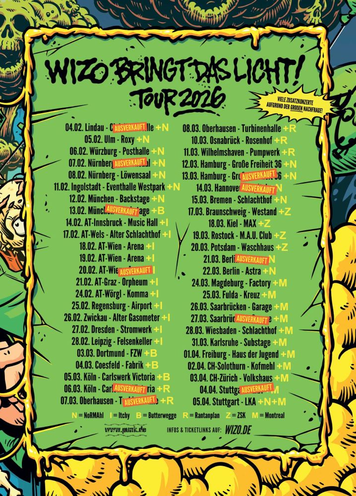 Auf der Tour gibt’s neue Songs, alte Klassiker zum Mitschreien und natürlich jede Menge Interaktion mit dem Publikum – denn WIZO wären nicht WIZO, wenn sie nicht auch 2026 zeigen würden, dass Punkrock immer noch Herz hat und nicht nur Nostalgie ist.