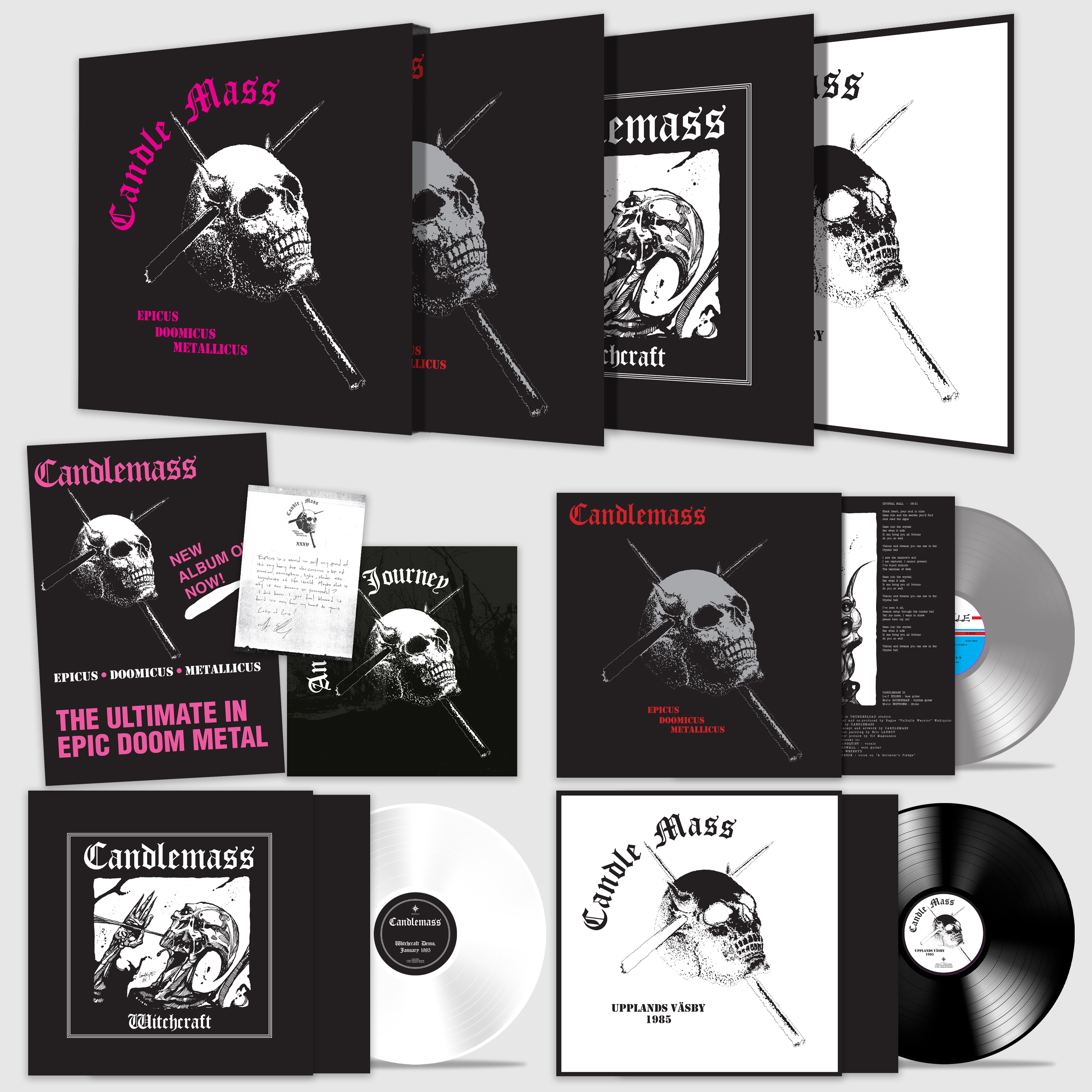 Auf der ersten LP ist eine remasterte Version des tonnenschweren Meisterwerks zu hören, welches durch das neue Remaster noch heavier klingt. Über die Songs muss man nicht mehr viel sagen,"Demon's Gate", "Cristal Ball", "Black Stone Wielder" oder das unsterbliche "Solitude" sind Klassiker und haben sich in den 80ern schon in meine Seele gebrannt und mich aus schweren Zeiten katapultiert. Der überraende Gesang von Jonas Langquist, der nur als (Session?!) Sänger für das Album eingesetzt wurde ist unschlagbar und konnte darauf wirklich nur vom "singenden Mönch" Messiah Marcolin ersetzt werden. Die Riffs sind tonnenschwer, die Produktion schon damals super heavy und düster. Trauer, Tod, Mythen und dukle Magie waren die Themen, die Bassist Leif Edling mit Epicus Doomicus Metallicus perfekt in die Seelen der Hörer transportierte. Für die Fans, die sich einen Einblick in die Entstehenung des Albums wünschen liegen zwei weitere LPs dabei. Auf einer LP Seite ist das Witschcraft Demo vom Januar 1985 zu hören. Zur Besetzung kann ich nichts sagen. Die Vocals reichen aber nicht an die Album Versionen von "Cristal Ball" und "A Sorcderer's Pledge" heran. Mit "Warchild" und "Into The Unfathomed Tower" sind aber zwei mir unbekannte schnellere Songs dabei. Im Dezember 1985 ging man ins OAL Studio und nahm "Black Stone Wielder" und "Demon's Gate" auf. Musikalisch sind sie den Albumversionen schon fast gleich, leiden aber unter den schwachen Vocals. Auf der dritten LP finden sich Uplands Vasby Rehearsals vom November 1985. Der Sound ist etwas rauer, kommt ultraheavy aus den Boxen. Man hört hier ein Band beim Proben. Komischerweise gefällt mir die "Demon's Gate" (1.) Version besser als die OAL Studio Version. Auch die anderen Versionen der Albumtracks lassen ahnen, was daraus dann schließlich wurde. Stark! Doom Fanatiker sollten sich das wertige Boxset besorgen, obwohl ein Preis von 84€ nicht gearde günstig ist. Na gut, es sollen ordentliche Booklets mit vielen wichtigen Infos und Bildern dabei liegen. Zudem handelt es sich um wertige graue, weiße und schwarze LPs. Und EPICUS DOOMICUS METALLICUS ist unerreicht und verdient diese intensieve Ausarbeitung. Schön, das Langquist seit einigen Jahren wieder bei CANDLEMASS ist und sich der Kreis schließt.