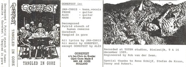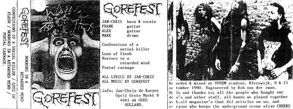 Frontmann Jan-Chris de Koeijer und Gitarrist Frank Harthoorn gründeten die Band und lieferten umgehend ein erstes Demo ab: „Tangled in Gore“. Der rohe, brutale Sound und das aggressive Riffing sowie die wütenden Growls sorgten bald dafür, dass die Mucke von GOREFEST in der Death Metal Szene schnell gern gehört wurde. Kein Wunder, dass bereits 1990 das zweite Demo folgte: „Horrors in a Retarded Mind“. Der Stil des Vorgängers wurde beibehalten und mit „Confessions of a Serial Killer“ enthielt das Teil wohl einen der größten Hits der Band.