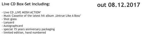 Unter dem Titel „Live Mosh Action“ wird dieser Traum der treuen Anhängerschaft nun materialisiert und kommt im Dezember als handnummerierte Box in die Läden. Neben der Live CD „Live Mosh Action“ gibt es eine Tape Version des letzten Albums „Untrue Like A Boss“ – ich nehme an, da die Band Kenntnis von der Autoradiosituation des Kollegen Lisons hat – sowie jede Menge Gimmicks.